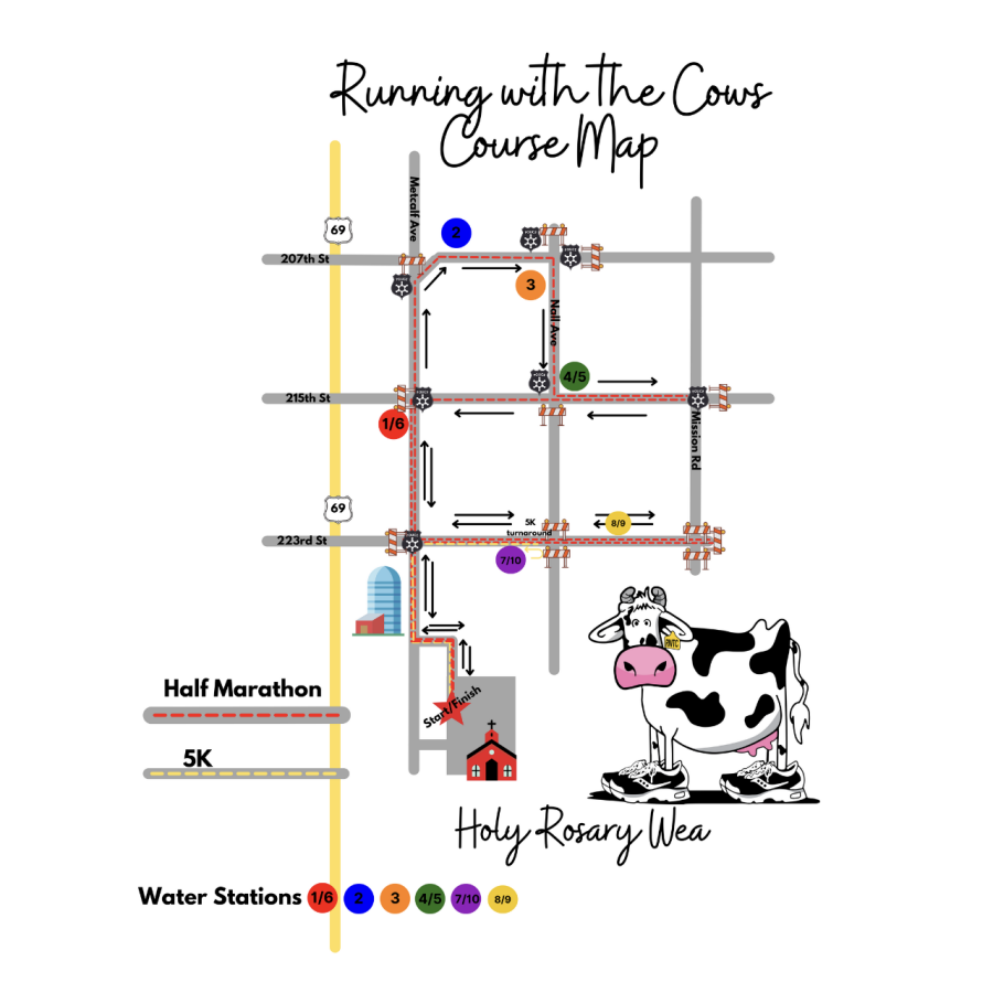 We're excited to welcome the HERD back for our 16th Annual Running with the Cows Half Marathon & 5K. Running with the Cows benefits Queen of the Holy Rosary Catholic School. We're a small, rural school serving families and their children, 3 years old through 8th grade. We're grateful for the support and LOVE we receive as our community comes together for service and FUN!